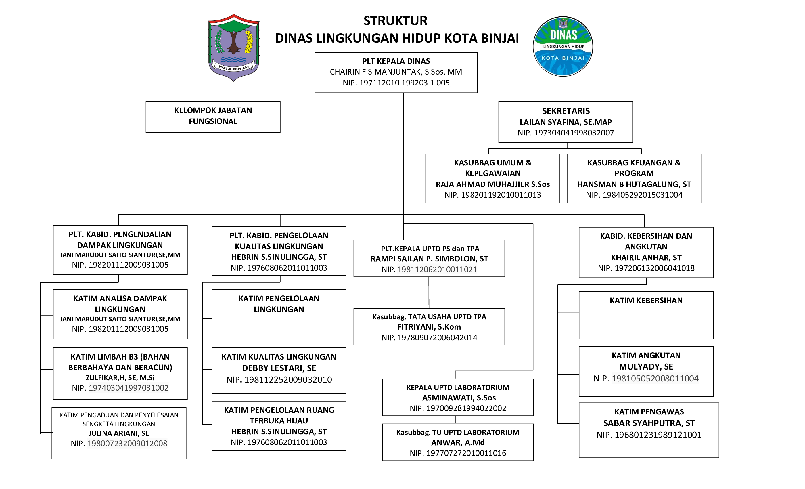 Susunan organisasi Dinas Lingkungan Hidup Kota Binjai dipimpin oleh seorang Kepala Dinas yang membawahi 1 Sekretariat , 3 Bidang dan 2 UPTD yaitu :
